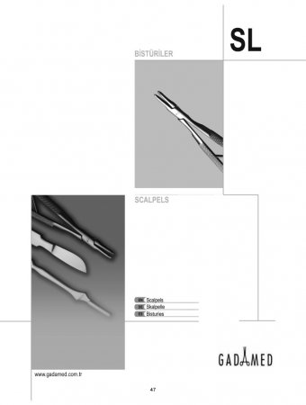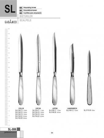 SL.0010.01 8681091005758 Diseksiyon Bıçağı fig.1 SL.0010.02 8681091005765 Diseksiyon Bıçağı fig.2 SL.0010.03 8681091005772 Diseksiyon Bıçağı fig.3 SL.0010.04 8681091005789 Diseksiyon Bıçağı fig.4 SL.0010.05 8681091005796 Diseksiyon Bıçağı fig.5 SL.0010.06 8681091005802 Diseksiyon Bıçağı fig.6 SL.0010.07 8681091005819 Diseksiyon Bıçağı fig.7 SL.0010.08 8681091005826 Diseksiyon Bıçağı fig.8 SL.0010.09 8681091005833 Diseksiyon Bıçağı fig.9 SL.0010.10 8681091005840 Diseksiyon Bıçağı fig.10 SL.0016.01 8681091005857 Diseksiyon Bıçağı SL.0020.01 8681091005864 Operasyon Bıçağı, Collin model fig.1 SL.0020.02 8681091005871 Operasyon Bıçağı, Collin model fig.2 SL.0020.03 8681091005888 Operasyon Bıçağı, Collin model fig.3 SL.0020.04 8681091005895 Operasyon Bıçağı, Collin model fig.4 SL.0020.05 8681091005901 Operasyon Bıçağı, Collin model fig.5 SL.0020.06 8681091005918 Operasyon Bıçağı, Collin model fig.6 SL.0026.01 8681091005925 Mikroskopik diseksiyon Bıçağı, fig.1 SL.0026.02 8681091005932 Mikroskopik diseksiyon Bıçağı, fig.2 SL.0054.08 8681091006007 Kıkırdak Bıçağı, Ahşap Kollu, Vırchow Model, 80 mm - 21.0cm SL.0060.16 8681091006014 Beyin Bıçağı, Vırchow Model, 160 mm - 26.0cm SL.0060.20 8681091006021 Beyin Bıçağı, Vırchow Model, 200 mm - 33.5cm SL.0060.24 8681091006038 Beyin Bıçağı, Vırchow Model, 240 mm - 38.0cm SL.0100.03 8681091006045 Bistüri Sapı, Standart model, No:3 SL.0104.03 8681091006052 Bistüri Sapı, Yivli Tipli, No:3 SL.0108.03 8681091006069 Bistüri Sapı, Ölçülü, No:3 SL.0112.20 8681091006076 Bistüri Sapı, No:3L SL.0112.35 8681091006083 Bistüri Sapı, No:3XL SL.0116.20 8681091006090 Bistüri Sapı, Açılı, No:3L SL.0116.35 8681091006113 Bistüri Sapı, Açılı, No:3XL, 35Cm SL.0120.04 8681091006120 Bistüri Sapı, No:4 SL.0124.20 8681091006137 Bistüri Sapı, No:4L SL.0124.35 8681091006144 Bistüri Sapı, No:4XL, 35 CM SL.0128.20 8681091006151 Bistüri Sapı, Uzun Açılı, No:4L SL.0128.35 8681091006175 Bistüri Sapı, Açılı, No:4XLA 35CM SL.0132.07 8681091006182 Bistüri Sapı, No:7 SL.0136.07 8681091006199 Bistüri Sapı, Özel Model, No: 7K SL.0140.08 8681091006205 Bistüri Sapı, Collın Model, No:8 SL.0148.13 8681091006212 Amputasyon Bıçagı, Collın Model, 13CM SL.0148.16 8681091006229 Amputasyon Bıçagı, Collın Model, 16CM SL.0148.19 8681091006236 Amputasyon Bıçagı, Collın Model, 19CM SL.0148.22 8681091006243 Amputasyon Bıçagı, Collın Model, 22CM SL.0148.28 8681091006250 Amputasyon Bıçagı, Collın Model, 28CM SL.0154.11 8681091006267 Kıkırdak Bıçağı, çift kenar bıçak, Catlın Model, 11 cm SL.0154.16 8681091006274 Kıkırdak Bıçağı, çift kenar bıçak, Catlın Model, 16 cm SL.0154.19 8681091006281 Kıkırdak Bıçağı, çift kenar bıçak, Catlın Model, 19 cm SL.0154.22 8681091006298 Kıkırdak Bıçağı, çift kenar bıçak, Catlın Model, 22 cm SL.0160.17 8681091006304 Amputasyon Bıçağı, Liston Model, 17CM SL.0160.20 8681091006311 Amputasyon Bıçağı, Liston Model, 20CM SL.0164.12 8681091006328 Amputasyon Bıçağı, Langenbeck Model,12CM SL.0170.09 8681091006335 Amputasyon Bıçağı, 9CM SL.0250.01 8681091006342 Katlanır Bıçak SL.0250.02 8681091006359 Katlanır Bıçak, Jilet bölümlü SL.0270.10 8681091006366 Kesici Bıçak, Troutman Chris Model, 9CM SL.0276.10 8681091006373 Tutcu Bıçak Açılı,Troutman Chris Model, 9CM SL.0284.13 8681091006380 Kesici Bıçak, Castroviejo Model, 13CM SL.0290.11 8681091006397 Bıçak Tutucu ve Kesici, 11CM SL.0330.00 8681091006403 Dermatom Bıçağı, Schınk Model, 30CM SL.0330.01 8681091006410 Dermatom Bıçağı, Yedek bıçak, Schınk Model, 30CM SL.0330.02 8681091006427 Dermatom ölçü cetveli, SL.0350.00 8681091006434 Dermatom Bıçağı, Humby Model SL.0350.01 8681091006441 Dermatom Bıçağı, Yedek Bıçak, Humby Model,