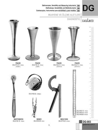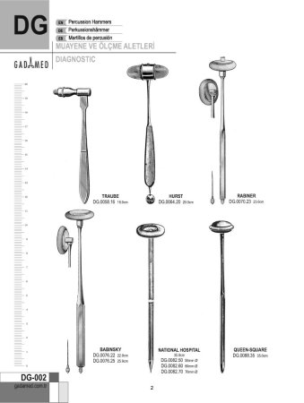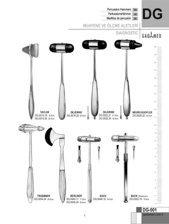 DG.0010.18 8681091000012 Refleks çekici Taylor 18cm DG DG.0010.20 8681091000029 Refleks çekici Taylor 20cm DG DG.0016.20 8681091000036 Refleks çekici Dejerine 20cm DG DG.0022.21 8681091000043 Refleks çekici Dejerine 21cm DG DG.0022.35 8681091000050 Refleks çekici Dejerine 35cm DG DG.0028.22 8681091000067 Refleks çekici Neuro-Duofleks 35cm DG DG.0034.24 8681091000074 Refleks çekici Troemner 24cm DG DG.0040.17 8681091000081 Refleks çekici Berliner 17cm DG DG.0040.20 8681091000098 Refleks çekici Berliner 20cm DG DG.0046.18 8681091000104 Refleks çekici Buck 18cm DG DG.0052.18 8681091000111 Refleks çekici Buck Teleskopik 18cm DG DG.0058.16 8681091000128 Refleks çekici Traube 16cm DG DG.0064.20 8681091000135 Refleks çekici Hurst 20cm DG DG.0070.23 8681091000142 Refleks çekici Rabiner 23cm DG DG.0076.22 8681091000159 Refleks çekici Babinsky 23cm DG DG.0076.25 8681091000166 Refleks çekici Babinsky 25cm DG DG.0082.50 8681091000173 Refleks çekici National Hospital 50mm 25cm DG DG.0082.60 8681091000180 Refleks çekici National Hospital 60mm 25cm DG DG.0082.70 8681091000197 Refleks çekici National Hospital 70mm 25cm DG DG.0088.35 8681091000203 Refleks çekici Queen Square 70mm 25cm DG DG.0110.18 8681091000210 Steteskop ahşap Pinard 18cm DG DG.0116.15 8681091000227 Steteskop plastik Pinard 15cm DG DG.0120.15 8681091000234 Steteskop plastik Alüminyum 15cm DG DG.0122.15 8681091000241 Steteskop plastik 15cm Alüminyum DG DG.0130.19 8681091000258 Muayene, ölçme, teşhis wartenberg model 19 cm DG DG.0150.02 8681091000265 Mezura 2 metre DG DG.0160.09 8681091000272 Estezyometre, weber model 9 cm DG DG.0170.23 8681091000289 Goniometre, Moeltgen model 23 cm DG DG.0180.15 8681091000296 cetvel metal 15 cm DG DG.0180.30 8681091000302 cetvel metal 30 cm DG DG.0180.60 8681091000319 cetvel metal 60 cm DG DG.0190.00 8681090899600 Steteskop çift tararlı DG DG.0196.00 8681091000333 Steteskop tek taraflı DG DG.0200.00 8681091000340 Kafa lambası DG DG.0210.00 8681091000357 Kafa aynası DG DG.0220.00 8681091000364 Otoskop set sert plastik kutulu DG DG.0224.00 8681091000371 Otoskop set yumuşak çantalı DG DG.0230.00 8681091000388 Oftalmoskop set sert plastik kutulu DG DG.0240.00 8681091000395 Otoskop ve Oftalmoskop kombinasyon set DG DG.0250.00 8681091000401 KBB teşhis set DG