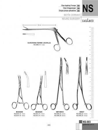 NS.0010.16 8681091050857 RANEY KLİPS UYGULAMA SÖKME FORSEPSİ 16.5CM NS.0012.16 8681091050864 RANEY KLİPS UYGULAMA SÖKME FORSEPSİ 16.5CM NS.0020.20 8681091050871 DAHLGREN KRANİYEL RONGÖR FORSEPSİ 20CM, 2 KANCALI NS.0026.21 8681091050888 DE VİLBİSS KRANİYEL RONGÖR 21CM, BİR ADET BÜYÜK NS.0030.33 8681091050895 DE MARTEL GİGLİ TESTERE KILAVUZU/KONDÜKTÖR 33CM NS.0040.00 8681091050901 GİGLİ TESTERE SAPI (ÇİFT) NS.0042.30 8681091050918 OLIVECRONA GIGLI TESTERE TELİ X2 BURGU 30CM NS.0042.40 8681091050925 OLIVECRONA GIGLI TESTERE TELİ X2 BURGU 40CM NS.0042.50 8681091050932 OLIVECRONA GIGLI TESTERE TELİ X2 BURGU 50CM NS.0042.60 8681091050949 OLIVECRONA GIGLI TESTERE TELİ X2 BURGU 60CM NS.0042.70 8681091050956 OLIVECRONA GIGLI TESTERE TELİ X2 BURGU 70CM NS.0043.30 8681091050963 OLIVECRONA GIGLI TESTERE TELİ X3 BURGU 30CM NS.0043.40 8681091050970 OLIVECRONA GIGLI TESTERE TELİ X3 BURGU 40CM NS.0043.50 8681091050987 OLIVECRONA GIGLI TESTERE TELİ X3 BURGU 50CM NS.0043.60 8681091050994 OLIVECRONA GIGLI TESTERE TELİ X3 BURGU 60CM NS.0043.70 8681091051007 OLIVECRONA GIGLI TESTERE TELİ X3 BURGU 70CM NS.0044.30 8681091051014 OLIVECRONA GIGLI TESTERE TELİ X4 BURGU 30CM NS.0044.40 8681091051021 OLIVECRONA GIGLI TESTERE TELİ X4 BURGU 40CM NS.0044.50 8681091051038 OLIVECRONA GIGLI TESTERE TELİ X4 BURGU 50CM NS.0044.60 8681091051045 OLIVECRONA GIGLI TESTERE TELİ X4 BURGU 60CM NS.0044.70 8681091051052 OLIVECRONA GIGLI TESTERE TELİ X4 BURGU 70CM NS.0050.01 8681091051069 CRUTCHFIELD TRAKSİYON TUTUCU KÜÇÜK NS.0050.02 8681091051076 CRUTCHFIELD TRAKSİYON TUTUCU BÜYÜK NS.0050.04 8681091051083 CRUTCHFIELD MATKAP UCU 3.5MM NS.0050.05 8681091051090 CRUTCHFIELD MATKAP UCU 5.0MM NS.0054.00 8681091051106 SERVİKAL TRAKSİYON TUTUCU BÜYÜK NS.0054.10 8681091051113 YALNIZCA TRAKSİYON TUTUCULARI İÇİN YEDEK PİN NS.0060.14 8681091051120 Olivecrona - Toennis Klips Forsepsi 14cm NS.0070.15 8681091051137 Mckenzie Klips Uygulama Forsepsi 15cm NS.0070.19 8681091051144 Mckenzie Klips Uygulama Forsepsi 19cm NS.0072.15 8681091051151 Mckenzie Klips Uygulama Forsepsi 15cm NS.0072.19 8681091051168 Mckenzie Klips Uygulama Forsepsi 19cm NS.0080.23 8681091051175 Smithwick Klips Uygulama Forsepsi 23cm NS.0080.26 8681091051182 Smithwick Klips Uygulama Forsepsi 26cm NS.0082.23 8681091051199 Sweet Klips Uygulama Forsepsi 23cm NS.0082.25 8681091051205 Sweet Klips Uygulama Forsepsi 26cm NS.0090.10 8681091051212 Cloward Laminia Ayırıcı, vida ile 110mm, 15cm NS.0090.30 8681091051229 Cloward Laminia Ayırıcı, vida ile 30mm, 15cm NS.0090.50 8681091051236 Cloward Laminia Ayırıcı, vida ile 50mm, 15cm NS.0090.70 8681091051243 Cloward Laminia Ayırıcı, vida ile 70mm, 15cm NS.0090.90 8681091051250 Cloward Laminia Ayırıcı, vida ile 90mm, 15cm NS.0092.10 8681091051267 Cloward Laminia Ayırıcı kam/rat. 110mm, 17cm NS.0092.30 8681091051274 Cloward Laminia Ayırıcı kam/rat. 30mm, 17cm NS.0092.50 8681091051281 Cloward Laminia Ayırıcı kam/rat. 50mm, 17cm NS.0092.70 8681091051298 Cloward Laminia Ayırıcı kam/rat. 70mm, 17cm NS.0092.90 8681091051304 Cloward Laminia Ayırıcı kam/rat. 90mm, 17cm NS.0096.16 8681091051311 Cloward Lamina Ayırıcı 16cm NS.0100.16 8681091051328 Inge Lamina Ayırıcı 17cm NS.0102.24 8681091051335 Inge Laminektomi Ayırıcı, 50mm, 24cm NS.0104.27 8681091051342 Inge Lamina Ayırıcı, 12mm uç, 27cm NS.0106.24 8681091051359 Inge Laminektomi Ayırıcı çene 10x20mm, 24cm NS.0108.24 8681091051366 Inge Laminektomi Ayırıcı çene 15x20mm, 24cm NS.0116.28 8681091051373 Inge Laminektomi Ayırıcı çene 22X15mm, 24cm NS.0120.19 8681091051380 LOVE SİNİR KÖKÜ EKARTÖRÜ DÜZ 19CM NS.0122.19 8681091051397 LOVE SİNİR KÖKÜ EKARTÖRÜ DÜZ 19CM 45 Ø AÇILI NS.0124.19 8681091051403 LOVE SİNİR KÖKÜ EKARTÖRÜ DÜZ 19CM 90 Ø AÇILI NS.0130.20 8681091051410 SCOVILLE SİNİR KÖKÜ EKARTÖRÜ AÇILI 7MM, 20CM NS.0134.21 8681091051427 MARTIN SİNİR KÖKÜ EKARTÖRÜ AÇILI 21CM NS.0140.21 8681091051434 KASPAR LOVE SİNİR EKARTÖRÜ 21.00CM NS.0144.06 8681091051441 CASPAR SİNİR KÖKÜ EKARTÖRÜ AÇILI 6MM, 24CM NS.0144.08 8681091051458 CASPAR SİNİR KÖKÜ EKARTÖRÜ AÇILI 8MM, 24CM NS.0144.10 8681091051465 CASPAR SİNİR KÖKÜ EKARTÖRÜ AÇILI 10MM, 24CM NS.0150.24 8681091051472 HOLSHER SİNİR KÖKÜ EKARTÖRÜ KAVİSLİ 7MM, 24CM NS.0154.23 8681091051489 SCOVILLE SİNİR KÖKÜ EKARTÖRÜ DÜZ 8MM, 23CM NS.0160.14 8681091051496 CUSHING DURA KANCALI KESKİN UÇ Í 2MM, 14CM NS.0164.13 8681091051502 FRAZIER KANCALI TEK KESKİN 13CM NS.0164.18 8681091051519 FRAZIER KANCALI TEK KESKİN 18CM NS.0166.13 8681091051526 FRAZIER DURA KANCALI KÜNT 13CM NS.0166.18 8681091051533 FRAZIER DURA KANCALI KÜNT 18CM NS.0170.13 8681091051540 LAHEY DURA KANCA 13CM NS.0174.15 8681091051557 TOENNIS DURA KANCA 15CM NS.0180.16 8681091051564 GRAHAM SİNİR KANCASI KÜNT 16.5CM NS.0184.18 8681091051571 SACHS SİNİR KANCASI 18.5CM NS.0190.20 8681091051588 DANDY SİNİR KANCASI 20CM NS.0192.20 8681091051595 DANDY SİNİR KANCASI 20CM NS.0194.20 8681091051601 DANDY SİNİR KANCASI 20CM NS.0200.22 8681091051618 HOEN DURA KANCALI KÜNT 22CM NS.0204.20 8681091051625 ADSON SİNİR KANCASI KÜNT 20CM NS.0206.20 8681091051632 ADSON SİNİR KANCASI KESKİN 20CM NS.0210.30 8681091051649 SCOVILLE AÇILI KANCA ve DİSSEKTÖR D/E 30CM NS.0212.30 8681091051656 SCOVILLE KAVİSLİ KANCA ve DİSSEKTÖR D/E 30CM NS.0216.29 8681091051663 SMITHWICJ SİNİR KANCASI KÜÇÜK 29CM NS.0220.19 8681091051670 CUSHING SİNİR KANCASI KÜÇÜK 19CM NS.0220.28 8681091051687 CUSHING SİNİR KANCASI KÜÇÜK 28CM NS.0222.19 8681091051694 CUSHING SİNİR KANCASI BÜYÜK 19CM NS.0222.28 8681091051700 CUSHING SİNİR KANCASI BÜYÜK 28CM NS.0226.17 8681091051717 SMITHWICK SİNİR KANCASI 17CM NS.0226.21 8681091051724 SMITHWICK SİNİR KANCASI 21CM NS.0230.24 8681091051731 DAVIS DURA DİSSEKTÖR ÇİFTE 24CM NS.0234.18 8681091051748 OLIVECRONA DURA DİSSEKTÖR D/E 18CM NS.0234.24 8681091051755 OLIVECRONA DURA DİSSE