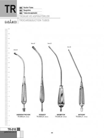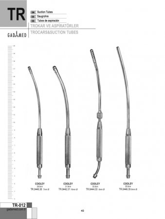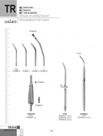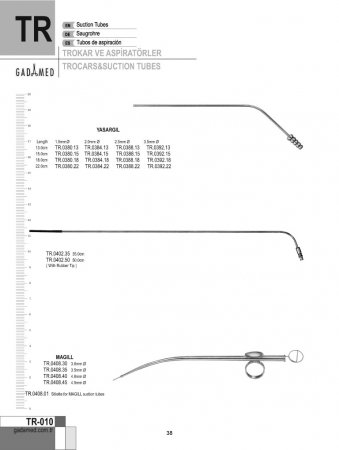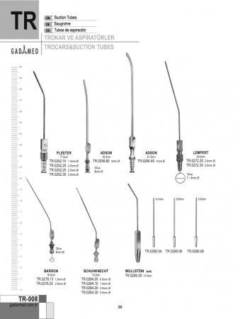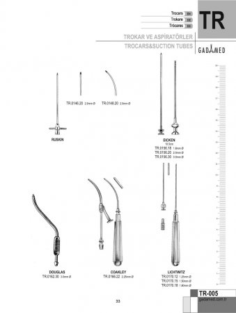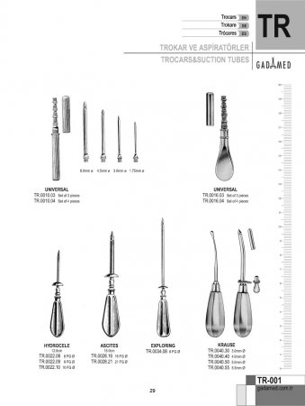 TR.0010.03 8681091003051 Trokar, universal model 3 bıçak, 1 tutamaç set w TR.0010.04 8681091003068 Trokar, universal model 4 bıçak 1 tutamaç set w TR.0016.03 8681091003075 Trokar, universal model 3 bıçak, 1 tutamaç set F TR.0016.04 8681091003082 Trokar, universal model 4 bıçak 1 tutamaç set F TR.0022.08 8681091003099 Trokar, Hydrocele model 8FG 12 cm TR.0022.09 8681091003105 Trokar, Hydrocele model 9FG 12 cm TR.0022.10 8681091003112 Trokar, Hydrocele model 10FG 12 cm TR.0028.16 8681091003129 Trokar, Ascites model 16FG 15 cm TR.0028.21 8681091003136 Trokar, Ascites model 21FG 15 cm TR.0034.08 8681091003143 Trokar, Exploring model 8FG TR.0040.30 8681091003150 Trokar, Krause model 3,0 mm TR.0040.40 8681091003167 Trokar, Krause model 4,0 mm TR.0040.50 8681091003174 Trokar, Krause model 5,0 mm TR.0040.55 8681091003181 Trokar, Krause model 5,5 mm TR.0048.25 8681091003198 Trokar, Nelson model 25 FG 21 cm fig.1 TR.0048.30 8681091003204 Trokar, Nelson model 30 FG 21 cm fig.2 TR.0048.33 8681091003211 Trokar, Nelson model 33 FG 21 cm fig.3 TR.0048.35 8681091003228 Trokar, Nelson model 35 FG 21 cm fig.4 TR.0056.90 8681091003235 Trocar, Johansson model 9mm 18 cm TR.0060.50 8681091003242 Trocar, Billroth model 5 mm 24 cm TR.0060.60 8681091003259 Trocar, Billroth model 6 mm 24 cm TR.0066.80 8681091003266 Trocar, Buelau model 8mm 24 cm TR.0074.50 8681091003273 Trocar, Fleurant model 5 mm TR.0080.50 8681091003280 Trocar, Fleurant model 5 mm 23 cm TR.0090.30 8681091003297 Trokar standart 3 mm 11 cm TR.0090.35 8681091003303 Trokar standart 3.5 mm 11 cm TR.0090.40 8681091003310 Trokar standart 4 mm 11 cm TR.0090.45 8681091003327 Trokar standart 4.5 mm 11 cm TR.0090.50 8681091003334 Trokar standart 5 mm 11 cm TR.0090.55 8681091003341 Trokar standart 5.5 mm 11 cm TR.0090.60 8681091003358 Trokar standart 6 mm 11 cm TR.0094.30 8681091003365 Trokar standart musluklu 3 mm 11 cm TR.0094.35 8681091003372 Trokar standart musluklu 3.5 mm 11 cm TR.0094.40 8681091003389 Trokar standart musluklu 4 mm 11 cm TR.0094.45 8681091003396 Trokar standart musluklu 4.5 mm 11 cm TR.0094.50 8681091003402 Trokar standart musluklu 5 mm 11 cm TR.0094.55 8681091003419 Trokar standart musluklu 5.5 mm 11 cm TR.0094.60 8681091003426 Trokar standart musluklu 6 mm 11 cm TR.0098.30 8681091003433 Trokar standart w/musluklu 3 mm 11 cm TR.0098.35 8681091003440 Trokar standart w/musluklu 3.5 mm 11 cm TR.0098.40 8681091003457 Trokar standart w/musluklu 4 mm 11 cm TR.0098.45 8681091003464 Trokar standart w/musluklu 4.5 mm 11 cm TR.0098.50 8681091003471 Trokar standart w/musluklu 5 mm 11 cm TR.0098.55 8681091003488 Trokar standart w/musluklu 5.5 mm 11 cm TR.0098.60 8681091003495 Trokar standart w/musluklu 6 mm 11 cm TR.0104.55 8681090987291 Duke Trokar ve Kanül Ø 5.5mm, 11 cm TR.0108.45 8681091003518 Trokar, Birch model 4.5 18 cm TR.0110.10 8681091003525 Trokar, kanül, Ochsner model 10 FG TR.0110.12 8681091003532 Trokar, kanül, Ochsner model 12 FG TR.0110.14 8681091003549 Trokar, kanül, Ochsner model 14 FG TR.0110.16 8681091003556 Trokar, kanül, Ochsner model 16 FG TR.0110.18 8681091003563 Trokar, kanül, Ochsner model 18 FG TR.0110.20 8681091003570 Trokar, kanül, Ochsner model 20 FG TR.0110.22 8681091003587 Trokar, kanül, Ochsner model 22 FG TR.0112.10 8681091003594 Trokar, kanül, toraks Ochsner model 10 FG TR.0112.12 8681091003600 Trokar, kanül, toraks Ochsner model 12 FG TR.0112.14 8681091003617 Trokar, kanül, toraks Ochsner model 14 FG TR.0112.16 8681091003624 Trokar, kanül, toraks Ochsner model 16 FG TR.0112.18 8681091003631 Trokar, kanül, toraks Ochsner model 18 FG TR.0112.20 8681091003648 Trokar, kanül, toraks Ochsner model 20 FG TR.0112.22 8681091003655 Trokar, kanül, toraks Ochsner model 22 FG TR.0128.30 8681091003662 Trokar, antrum pierce model 3.0 mm TR.0128.40 8681091003679 Trokar, antrum pierce model 4.0 mm TR.0128.50 8681091003686 Trokar, antrum pierce model 5.0 mm TR.0134.20 8681091003693 Trokar, Landau model 2.0 mm TR.0140.13 8681091003709 Trokar, Pean model 13.5 cm TR.0146.20 8681091003716 Trokar,düz antrum ruskin model 2.0 mm TR.0148.20 8681091003723 Trokar,eğri antrum ruskin model 2.0 mm TR.0156.18 8681091003730 Trokar, antrum eicken model 1.8 mm 10.5 cm TR.0156.20 8681091003747 Trokar, antrum eicken model 2.0 mm 10.5 cm TR.0156.30 8681091003754 Trokar, antrum eicken model 3.0 mm 10.5 cm TR.0162.30 8681091003761 Trokar, Douglas model 3.0 mm TR.0166.22 8681091003778 Trokar, Coakley model 2.25 mm TR.0170.12 8681091003785 Trokar, Lichtwitz model 1.25 mm TR.0170.15 8681091003792 Trokar, Lichtwitz model 1.50 mm TR.0170.18 8681091003808 Trokar, Lichtwitz model 1.80 mm TR.0176.30 8681091003815 İrrigasyon kanülü, 3mm 15 cm TR.0176.40 8681091003822 İrrigasyon kanülü, 4mm 15 cm TR.0176.50 8681091003839 İrrigasyon kanülü, 5mm 15 cm TR.0176.60 8681091003846 İrrigasyon kanülü, 6mm 15 cm TR.0182.14 8681091003853 Anestezi iğnesi, İowa model 14 cm TR.0190.08 8681091003860 Klavuz iğne, 8Fr 15 cm TR.0190.10 8681091003877 Klavuz iğne, 10Fr 15 cm TR.0190.12 8681091003884 Klavuz iğne, 12Fr 15 cm TR.0190.14 8681091003891 Klavuz iğne, 14Fr 15 cm TR.0190.16 8681091003907 Klavuz iğne, 16Fr 15 cm TR.0190.18 8681091003914 Klavuz iğne, 18Fr 15 cm TR.0192.08 8681091003921 Klavuz iğne, Lancet tip 8Fr 15 cm TR.0192.10 8681091003938 Klavuz iğne, Lancet tip 10Fr 15 cm TR.0192.12 8681091003945 Klavuz iğne, Lancet tip 12Fr 15 cm TR.0192.14 8681091003952 Klavuz iğne, Lancet tip 14Fr 15 cm TR.0192.16 8681091003969 Klavuz iğne, Lancet tip 16Fr 15 cm TR.0192.18 8681091003976 Klavuz iğne, Lancet tip 18Fr 15 cm TR.0194.08 8681091003983 Klavuz iğne, Cclosure tip 8Fr 15 cm TR.0194.10 8681091003990 Klavuz iğne, Cclosure 10Fr 15 cm TR.0194.12 8681091004003 Klavuz iğne, Cclosure 12Fr 15 cm TR.0194.14 8681091004010 Klavuz iğne, Cclosure 14Fr 15 cm TR.0194.16 8681091004027 Klavuz iğne, Cclosure 16Fr 15 cm TR.0194.18 8681091004034 Klavuz iğne, LCclosure 18Fr 15 cm TR.0202.10 8681091004041 Veres iğnesi, 2x100 mm TR.02